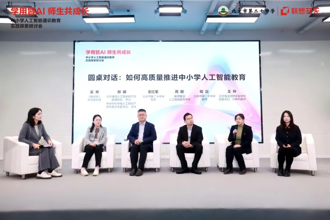圆桌对话环节聚焦“如何高质量推进中小学人工智能教育”展开研讨。董红军与北京通用人工智能研究院党支部书记、助理院长郑卿,北京海淀进修实验学校团委书记、计算机教师王玲,北京市第二十中学教师程磊,联想集团人工智能教育专家周聪围绕“推进中小学人工智能教育,学校要着力解决哪些问题?”“如何构建贯通大中小学的人工智能课程体系,系统性培养AI人才?”“如何汇聚多方力量,共建可持续发展的AI教育生态?”三大议题,从科研机构、学校、企业、教师等不同视角建言献策,提出“建立高校—企业—学校联合教研机制”“分层设计实践课程”“汇聚资源打造可持续生态”等建议。