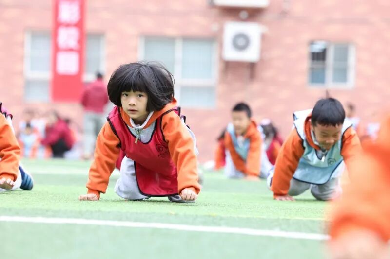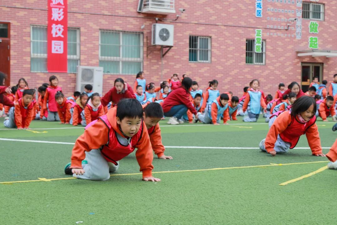 一年级的“毛毛虫大出动”,将爬行技巧游戏化,同学们踮脚紧跟,童真笑声温暖赛场;二年级“最长的绳子”挑战同学们身体的柔韧性,大家依次展开双腿,用默契搭建起“人形长绳”。