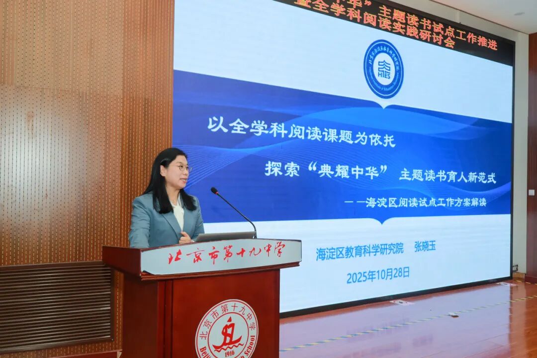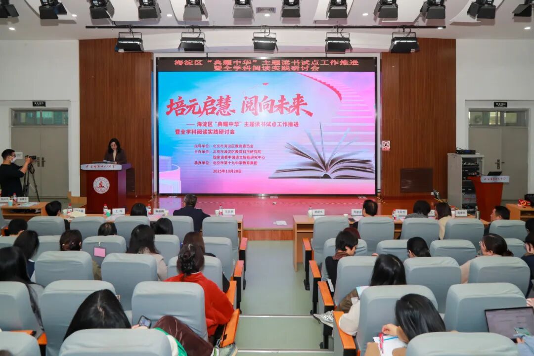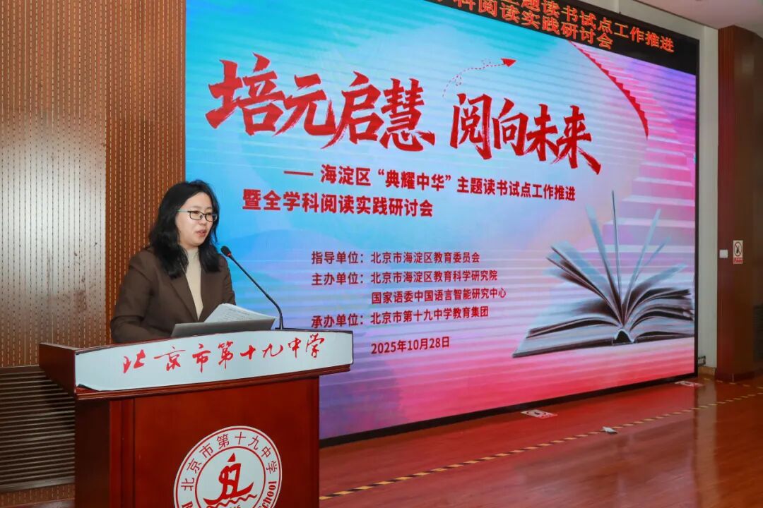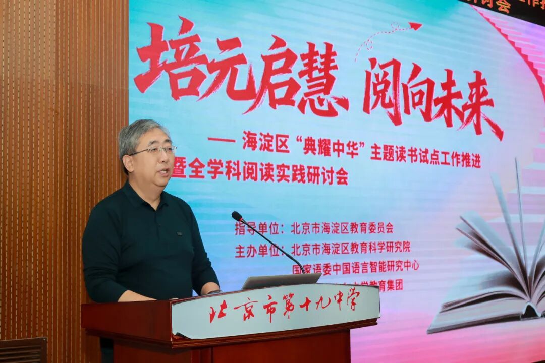 10月28日,海淀区“典耀中华”主题读书试点工作推进暨全学科阅读实践研讨会在北京市第十九中学召开。活动旨在深入落实教育部教育强国建设三年行动计划综合任务改革试点要求,系统推进海淀区承担的教育部语用司“探索‘典耀中华’主题读书育人范式”试点任务,集中凝练并分享海淀区中小学校在阅读教育实践中的宝贵经验与创新成果。国家语言文字工作委员会中国语言智能研究中心主任周建设、区教委副主任唐建东等嘉宾参加活动。活动由海淀区教科院副院长王瑞主持。