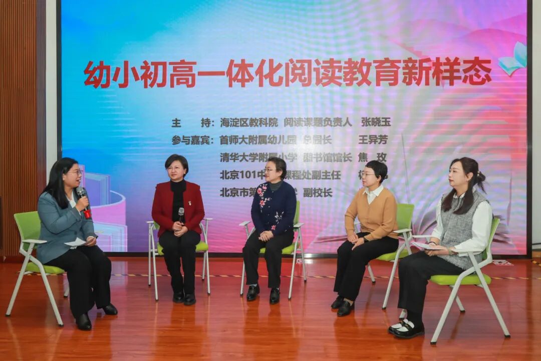 沙龙研讨环节,首师大学前教育学院副院长兼首师大附属幼儿园总园长王异芳、清华附小图书馆馆长焦玫、一零一中课程处副主任杨双伟以及十九中副校长归韫璐以“幼小初高阅读教育新样态”为主题,结合本校(园)实践,分享了不同学段阅读教育的创新做法。嘉宾们围绕“幼小衔接阅读习惯培养”“小学高段整本书阅读教学策略”“初高中学科阅读深度融合路径”等话题展开深入探讨,达成“阅读教育需打破学科壁垒与学段界限,实现协同贯通发展”的共识。