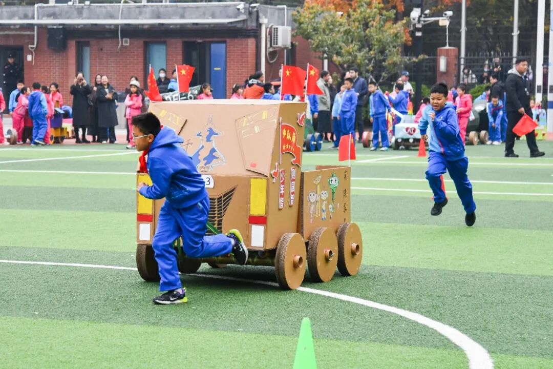 作为学校的传统王牌项目,四年级“纸箱车创意大赛”已办到第九届。今年主题紧扣“国防科工” ,各队伍在“协作运矿”竞速中,将工程设计、团队协作与家国情怀完美融合。