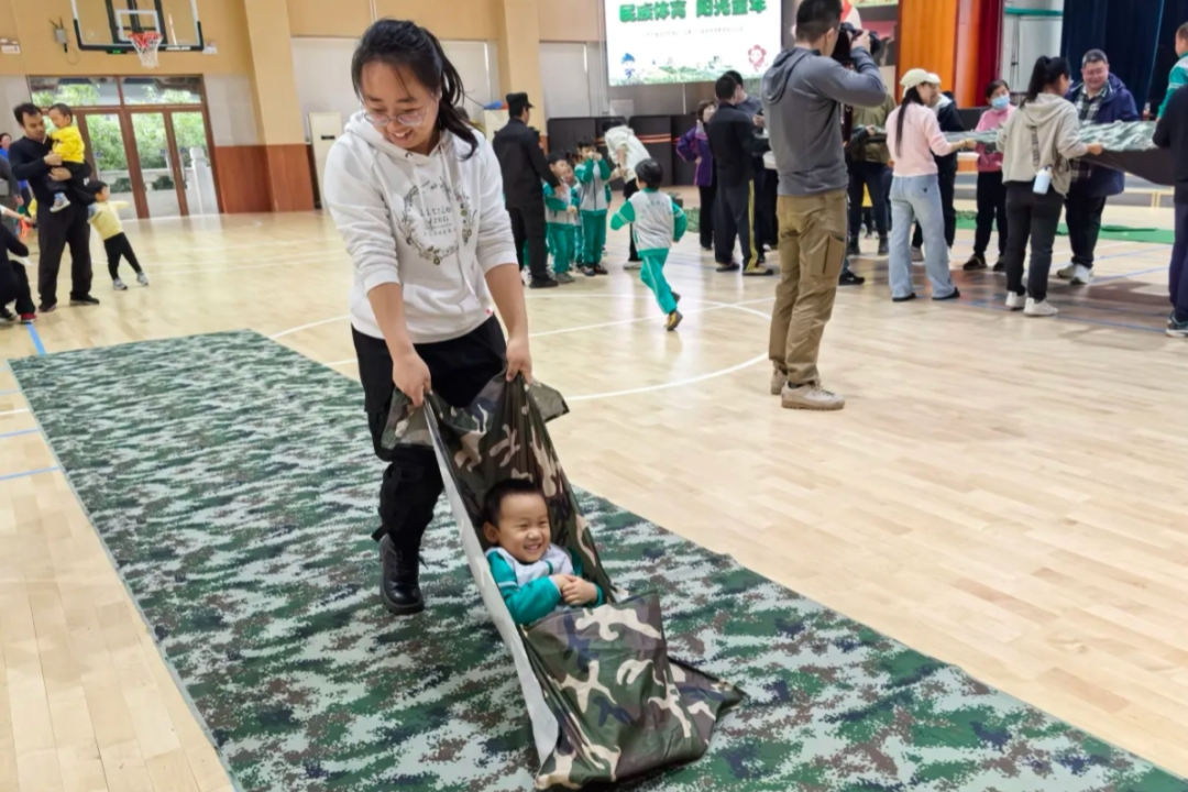 欢快的音乐响起,大班的运动员们抱着篮球闪亮登场。他们动作整齐,活力四射,瞬间点燃全场热情,为亲子运动会拉开精彩帷幕。各班运动员依次有序进场。在武术操展示阶段,孩子们扎稳马步,拳脚生风,一招一式虽稚嫩,却认真十足,尽显武术灵动的精气神。在竞技游戏环节,跳竹竿(黎族游戏)、猴子抬轿(满族游戏)、板鞋竞速(壮族游戏)、袋鼠快跑等项目引得大家争相参与。悄然间,家长和孩子们在游戏中增强了亲子情感,培养了默契,更锻炼了身体。