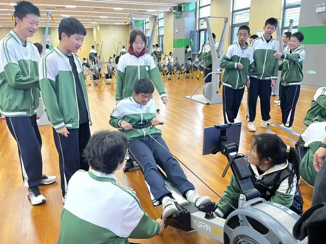 相比于其他运动器材,满分运动舱——划船机可谓是效率最高的运动器械,能全方位提升力量、速度、耐力、柔韧、灵敏等身体运动能力。学校采用划船机作为运动设备,开设了赛艇课。赛艇课上,大家纷纷在划船机上大展身手,迅速启动,奋力拉桨。