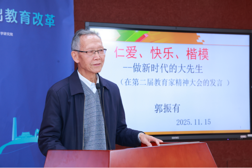 教育部原副总督学郭振有在发言中重点阐述了新时代“大先生”的培育之道,强调弘扬教育家精神是核心前提,并明确“大先生”四大特质:仁爱情怀广博无疆、精神格局崇高开阔、学术造诣深厚广博、文明担当志存高远。