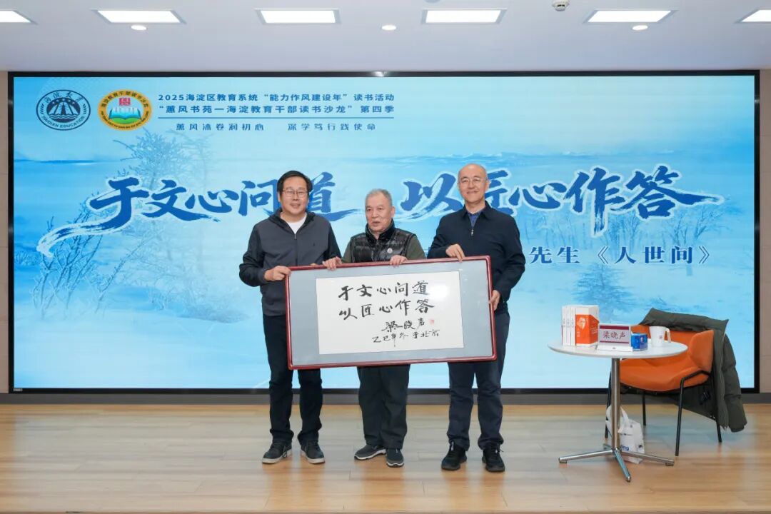 读书现场,史怀远和乔键接过梁晓声先生赠送给海淀教育的书法作品。这不仅是一份珍贵的纪念,更象征着一份文化的托付与传承。