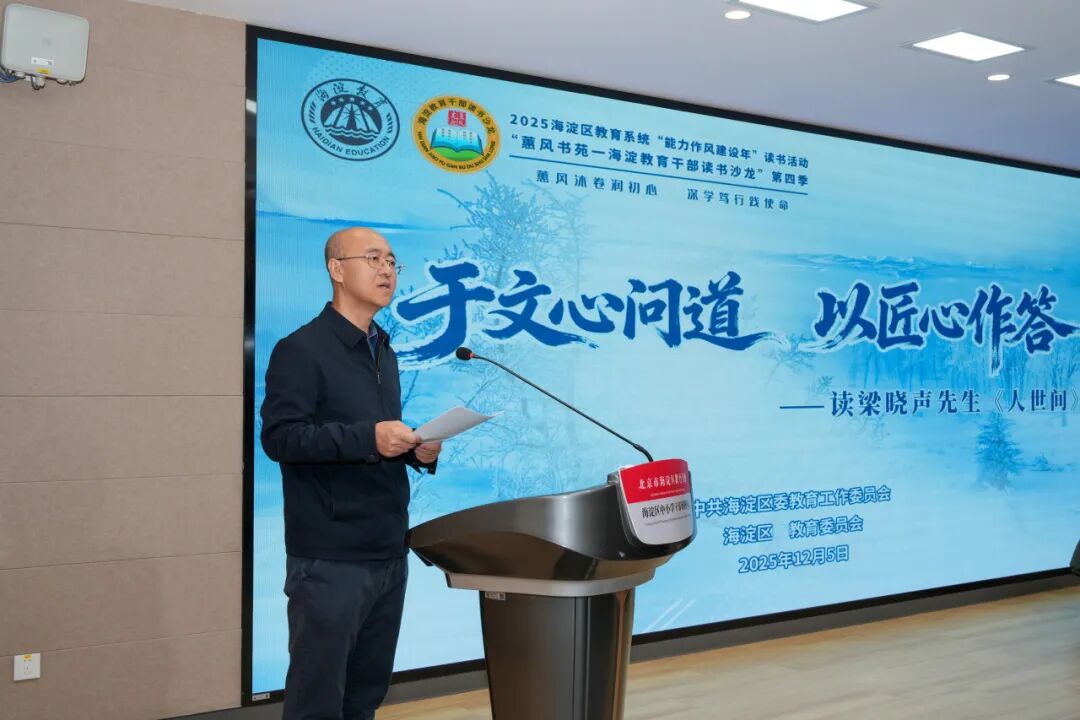 蕙风沐卷润初心,深学笃行践使命。从首季《论教育》的思想奠基,到第二季《教学的模样》的深耕细作,到第三季《人工智能》的时代挑战与回应,再到本季《人世间》的人文浸润,本年度“能力作风建设年”系列读书沙龙以持续深化的主题、丰富多元的形式、深度智慧的碰撞,构建了一个立体而完整的教育干部思想赋能体系,引领海淀教育人在这片沃土上共读共思,以教育者的匠心为笔墨,在强国建设的征程上书写着属于海淀教育的使命答卷。