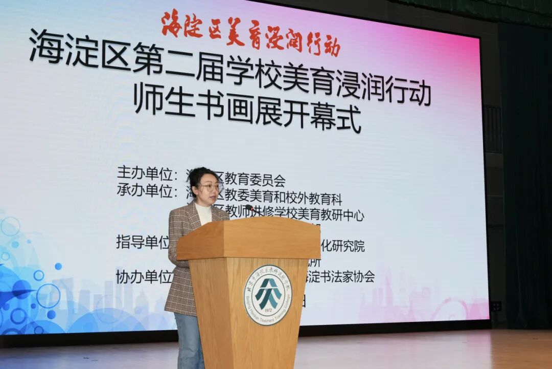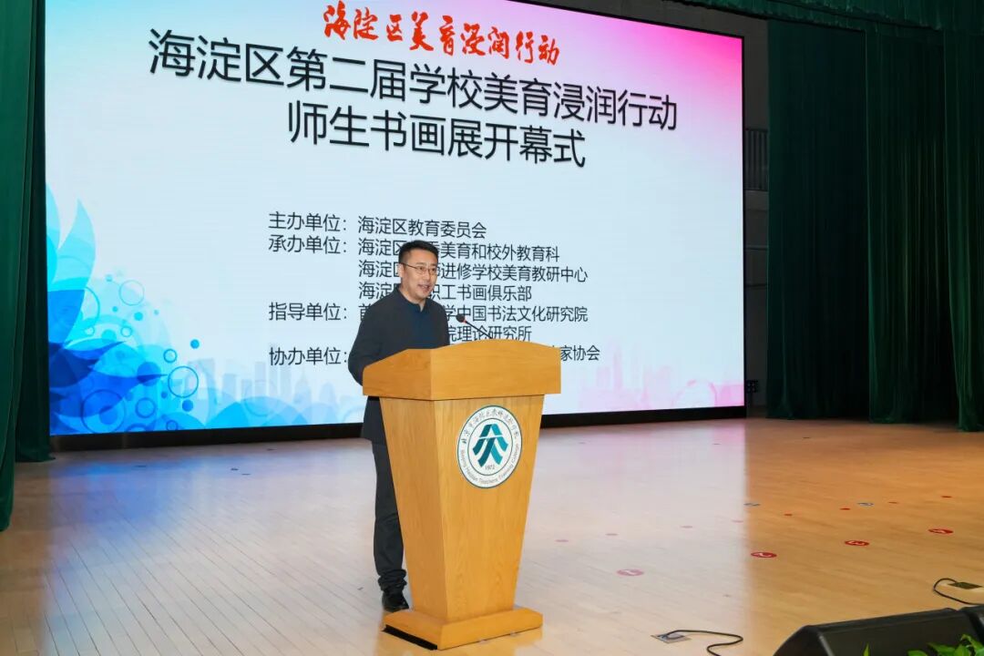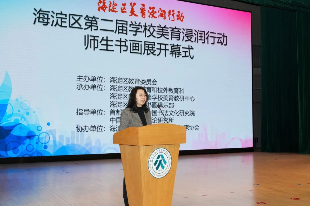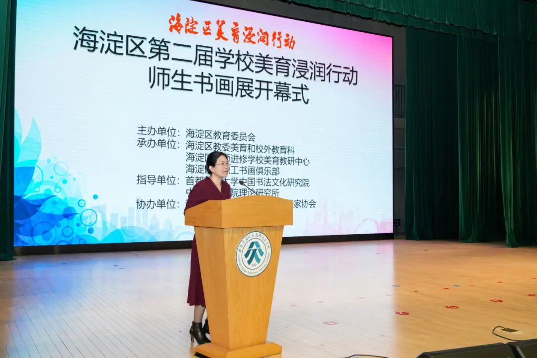 开幕式上,海淀区教师进修学校副校长陈俊荣在致辞中强调,美育是学生成长中不可或缺的“阳光雨露”,本次书画展是一堂“走出教室的美育大课”,也是一个“审美的游乐场”。她鼓励学生在艺术中学会欣赏、表达与共创。