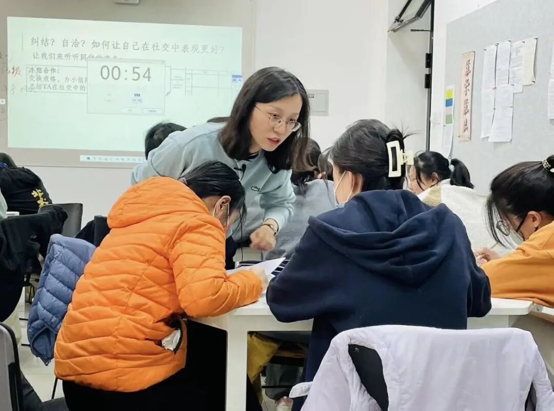 ▲《坚持辩证否定观》课中,张玉洁指导学生分析个体成长与外部社交的关系
