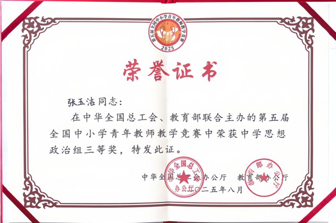 此次比赛得到了学校的高度重视。校长马玉国、书记王亚章统筹部署,政治学科组组成核心备赛团队,各部门协同配合,从教学内容打磨到模拟演练,为张玉洁提供了全方位、专业化的支持。