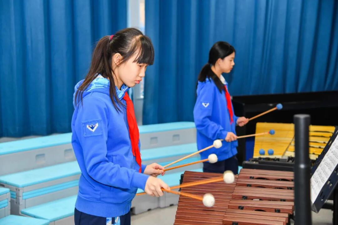 优美的马林巴琴声将镜头引至音乐教室。“这里升级改造后可是‘多功能艺术空间’!”音乐教师田甜介绍道,“不仅是日常课堂,也是合唱、马林巴社团的专属排练地。”