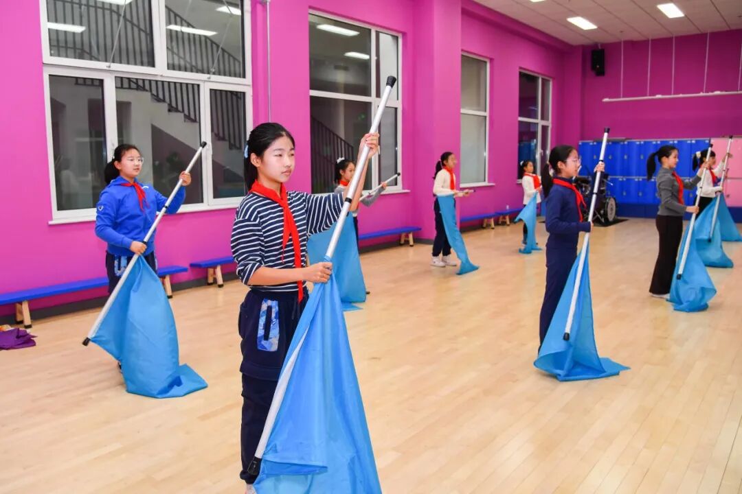 在地下一层更大的音乐教室中,金栗多老师正在指导旗舞训练。“这间教室就像一个百变的舞台,装得下音乐的浪漫,也容得下热情的律动。”