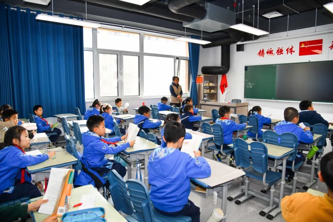 走进一间普通教室,四年级班主任张国红如数家珍:“新风系统能加热换气,守护健康;可调课桌椅保护脊柱与视力;智能投影与无线耳麦让教学更清晰高效……所有设计都是为了让孩子安心学习、开心成长。”学校的教室全部南向,采光均匀,专业录播设备支持课堂复盘,共同构建起智慧、健康的教学环境。