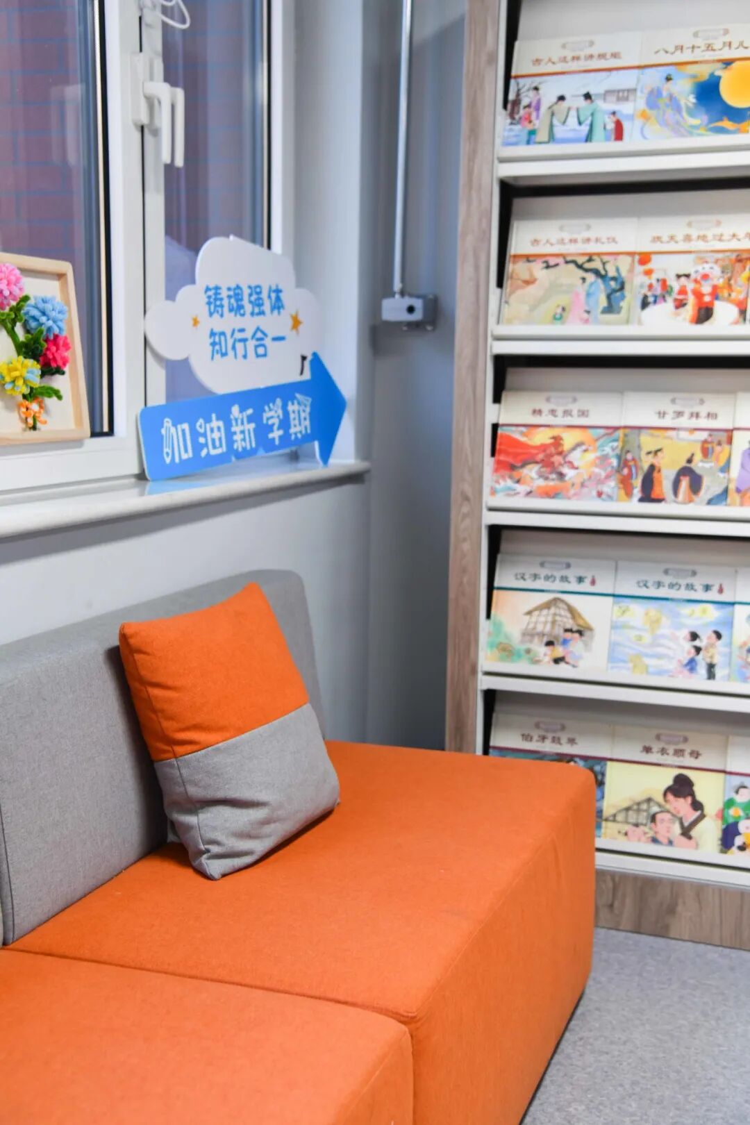 书香校园,润物无声。育鹰小学副校长张丽霞介绍道,学校自2015年启动“书香沁润育鹰,阅读滋养童年”分级阅读工程。在新校区,每个楼层都设置了开放的阅读区:一、二年级以绘本为主,三、四年级侧重科技人文,五、六年级提供社科文学与人物传记。针对楼道较长的特点,学校还贴心地设置了分散的小阅读区,并配有专供长时间沉浸的阅读教室,旨在为不同年龄段的孩子提供及时、丰富的成长滋养。