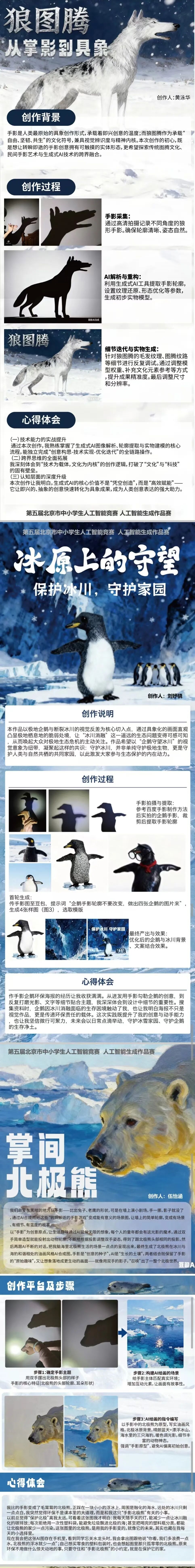 人工智能生成作品赛以“手影里的动物生活”为主题。学生通过应用生成式人工智能(AIGC)技术,以拍摄自己的手影为起点,构思创意场景与叙事情境,设计出原创作品。活动面向小学、中学(含初中、高中)。同时,该项目为个人项目,每名学生可申报1名辅导教师。评委从艺术审美、技术实现、创意叙事三个维度进行评审,鼓励学生运用AI和AIGC技术,探索艺术设计与科技融合创新路径,培养设计能力及审美素养。