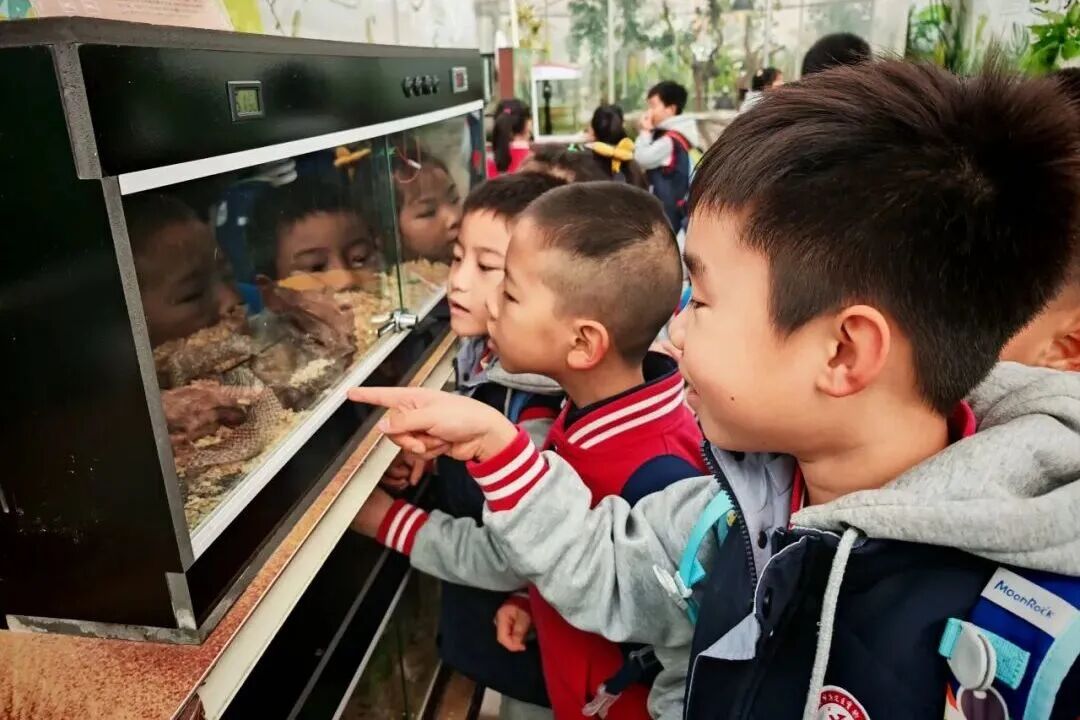 热带雨林爬虫馆里,课本上难懂的“生物适应性”,一下子变成了眼前的小奇迹:有的爬虫躲在绿色叶子里,不仔细看根本找不到,像在玩捉迷藏;有的身上裹着硬硬的“小盔甲”,摸起来凉凉的。孩子们睁大眼睛观察着,有的还掏出研学手册想记下来,生怕错过任何一个神奇瞬间。萌宠乐园里,小动物们凑过来蹭手心,同学们轻轻触摸它们软软的毛,脸上露出开心的笑容。