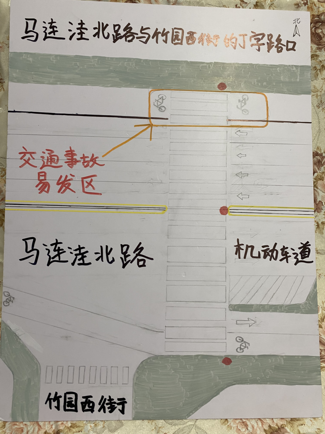 马连洼北路与竹园西街丁字路口是惠泽宸上学的必经之路。早高峰7:40—8:10,等待过马路的家长起步时,常遇到直行骑车的人闯红灯通行,多次出现近距离避让、剐蹭及轻微碰撞等情况。