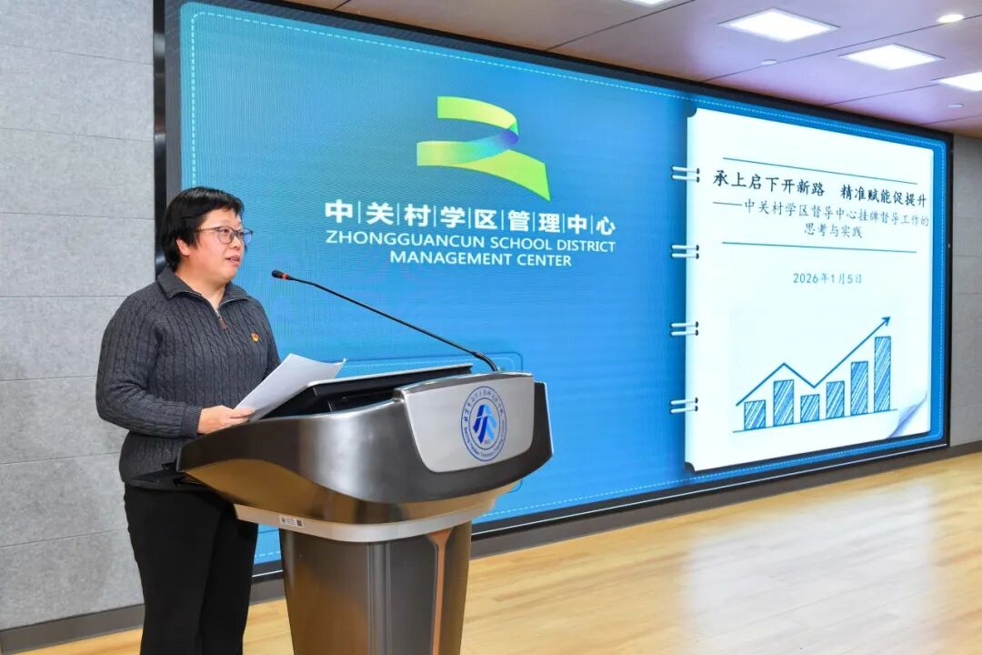 中关村学区督导中心副主任督学翁燕平以《承上启下开新路 精准赋能促提升》为题,分享了学区层面统筹推进督导工作的创新举措,为学区督导中心特色建设树立了优秀范例。
