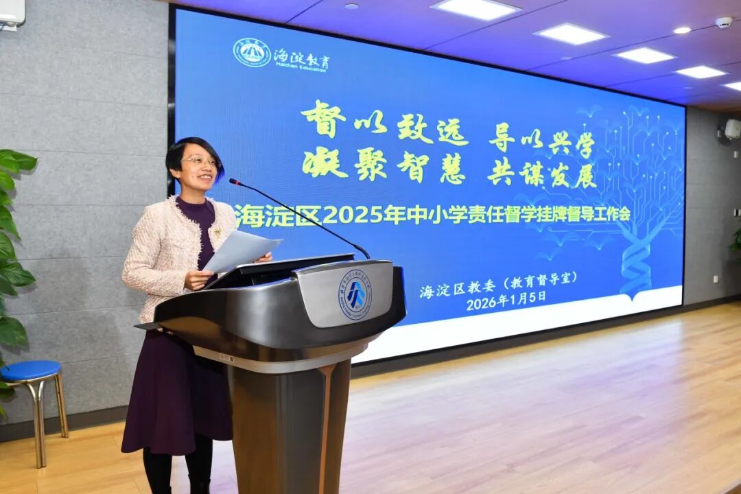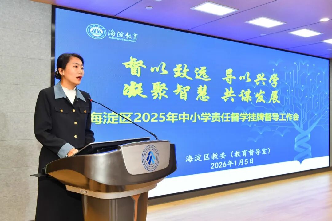 为深化新时代教育督导体制机制改革,推动区域教育督导工作再上新台阶,2026年1月5日,海淀区2025年中小学责任督学挂牌督导工作会召开。北京市教委督学处副处长赵以文、市教委挂牌督导工作负责人贾姜媛、国家教育行政学院《中小学校长》杂志发展研究部主任柏丹,区教委副主任耿玥及相关科室和部门领导,各学区督导中心主任督学及相关负责人、全体中小学挂牌责任督学、校外培训机构挂牌督学、各中小学校视导员等400余人共同参加会议。