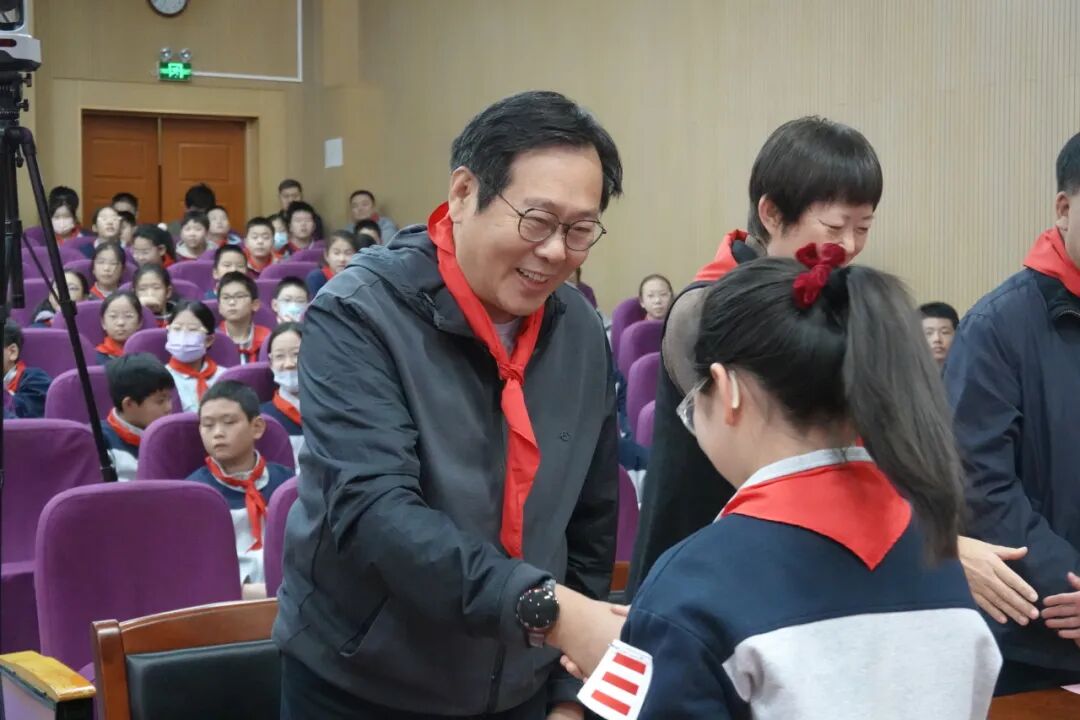 海淀区关工委副主任、海淀区教育系统关工委主任乔键,海淀区教育工委书记助理、海淀区教育系统关工委秘书长刘昊,民进海淀区委副主委、海淀区政协常委、海淀区教育系统关工委副主任刘芳,海淀区教育系统关工委副主任牛震云,海淀区教育系统关工委副秘书长刘红艳,以及首都师范大学附属花园小学书记王钢、校长贾素艳等嘉宾参加活动。活动伊始,少先队员代表为各位嘉宾佩戴红领巾,用童真的礼仪表达崇高敬意。
