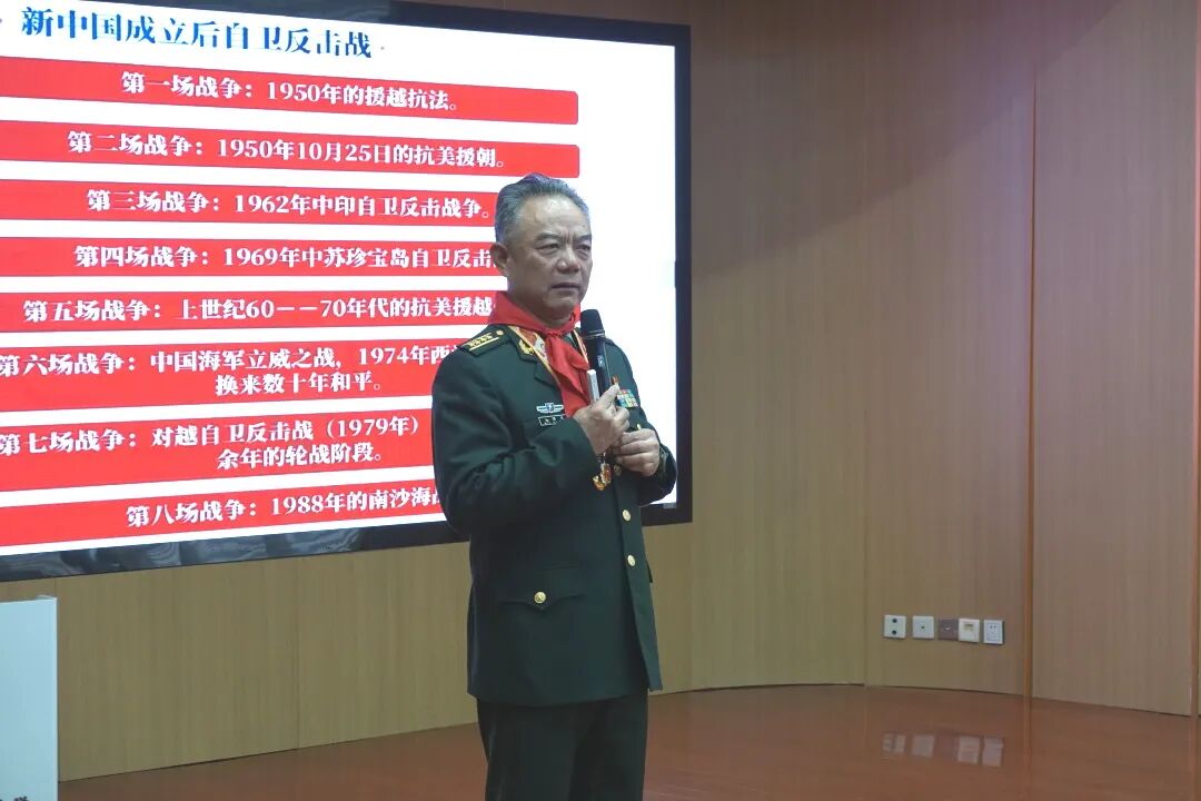 本次思政课的授课专家王曙光有着传奇的军旅生涯。1983年入伍的他曾荣立战时一等功,是一等伤残军人;2017年作为现役英模代表参加中国人民解放军建军90周年庆祝大会,2024年获评北京十大榜样人物。同时,他还担任北京“薪火”红色宣讲团导师、北京市“爱我国防”宣讲团团员等职务,长期致力于红色精神的传播与传承。课堂上,王曙光结合自身经历,以深入浅出的语言、饱含深情的讲述,带领同学们回溯烽火连天的战斗岁月。从浴血奋战的英雄事迹到矢志不渝的爱国信仰,从战争年代的艰难困苦到新时代的使命担当,一个个鲜活的故事、一段段深刻的感悟,让现场师生仿佛穿越时空,置身于民族独立抗争的峥嵘岁月,深切体悟到革命精神的丰富内涵与强大力量。