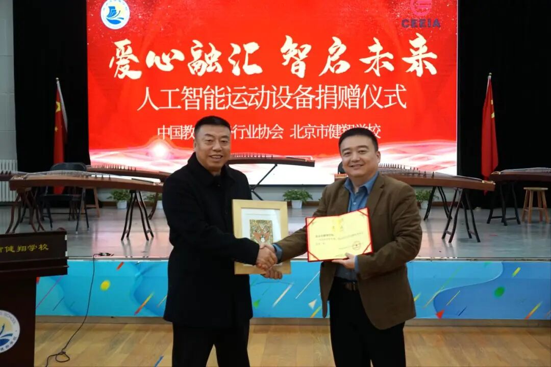 人工智能运动设备介绍视频直观展现了设备在个性化训练、数据监测等方面的强大功能。捐赠方代表——中国教育装备行业协会与受赠方代表——北京市健翔学校完成捐赠证书与学生礼品交换仪式。一纸证书,不仅是爱心的见证,更承载着社会与学校携手护航特殊儿童成长的郑重承诺。