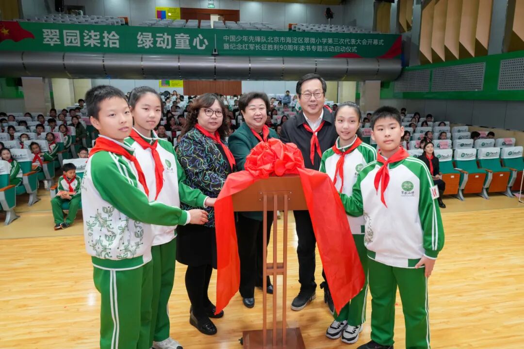在全体与会者的共同见证下,海淀区教育系统关工委主任乔键,翠微小学党委书记、少工委、关工委主任张国立,校长王冬娣与少先队员代表一同启动了“纪念红军长征胜利90周年读书专题活动”。