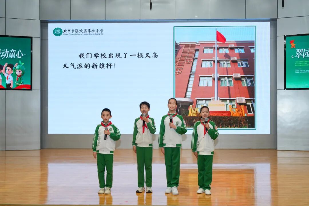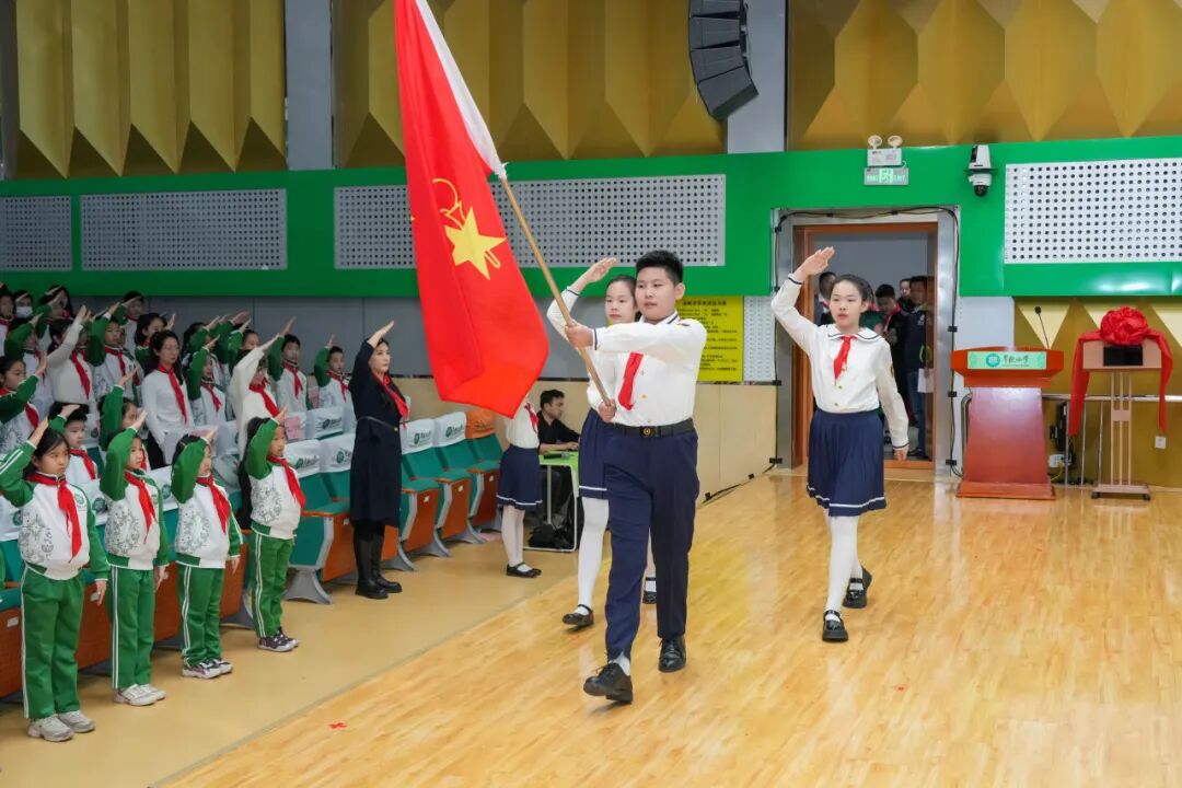 少先队员代表进行了学习任务汇报,并发出“七个一”活动倡议。他们以“校园里的‘红色坐标’”为主题,讲述了校园旗杆的特殊由来——2025年9月3日,纪念中国人民抗日战争暨世界反法西斯战争胜利80周年大会上的定制款。这杆矗立在校园中的崭新旗杆,不仅是赓续红色血脉的历史接力棒,更时刻召唤着一代又一代学子,将伟大的抗战精神薪火相传。