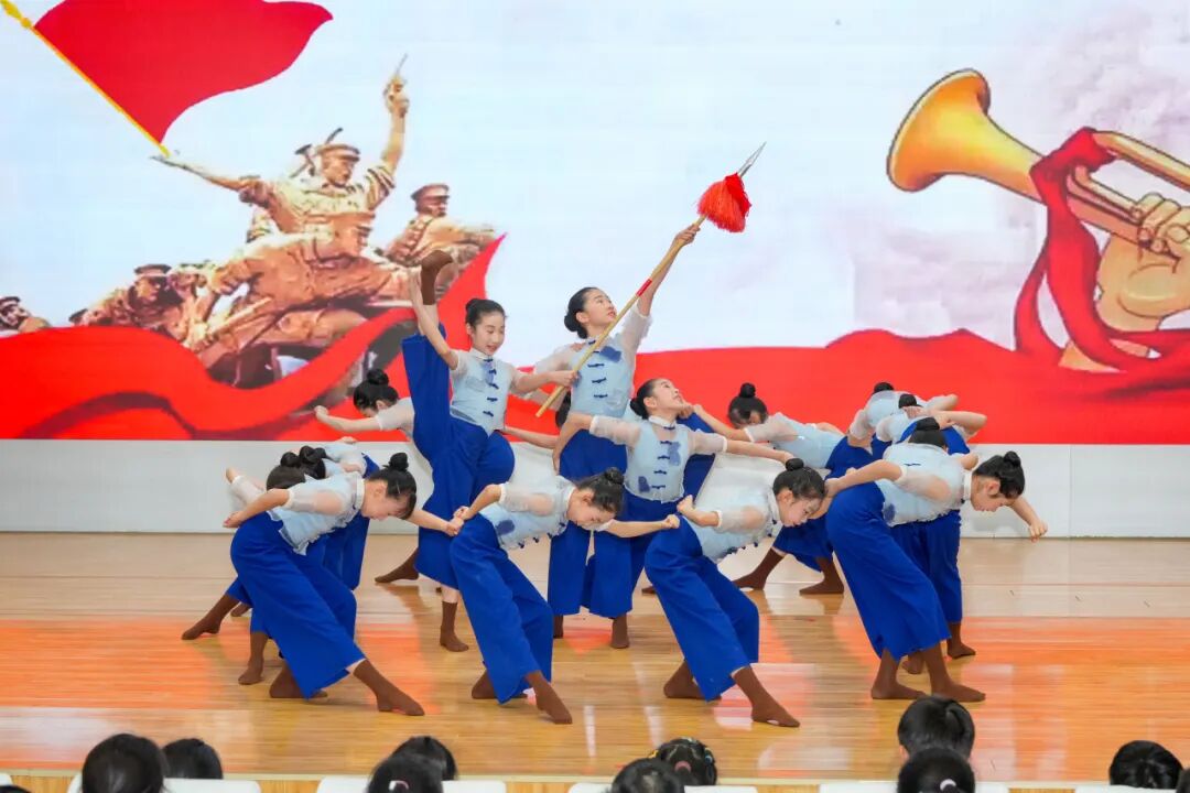 《映山红》舞蹈,《忆秦娥·娄山关》《七律·长征》《念奴娇·昆仑》朗诵轮番上演,少先队员们用稚嫩的声音发出铿锵有力的宣言。