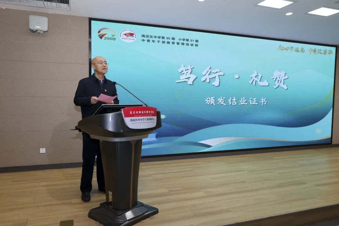 1月9日,海淀区中学第35期、小学第31期中青年干部教育管理培训班结业式举行。海淀区委教工委副书记史怀远,区教育党校党支部书记、常务副校长、中小学干部研修中心主任赵欣及部分学校书记、校长出席结业式。