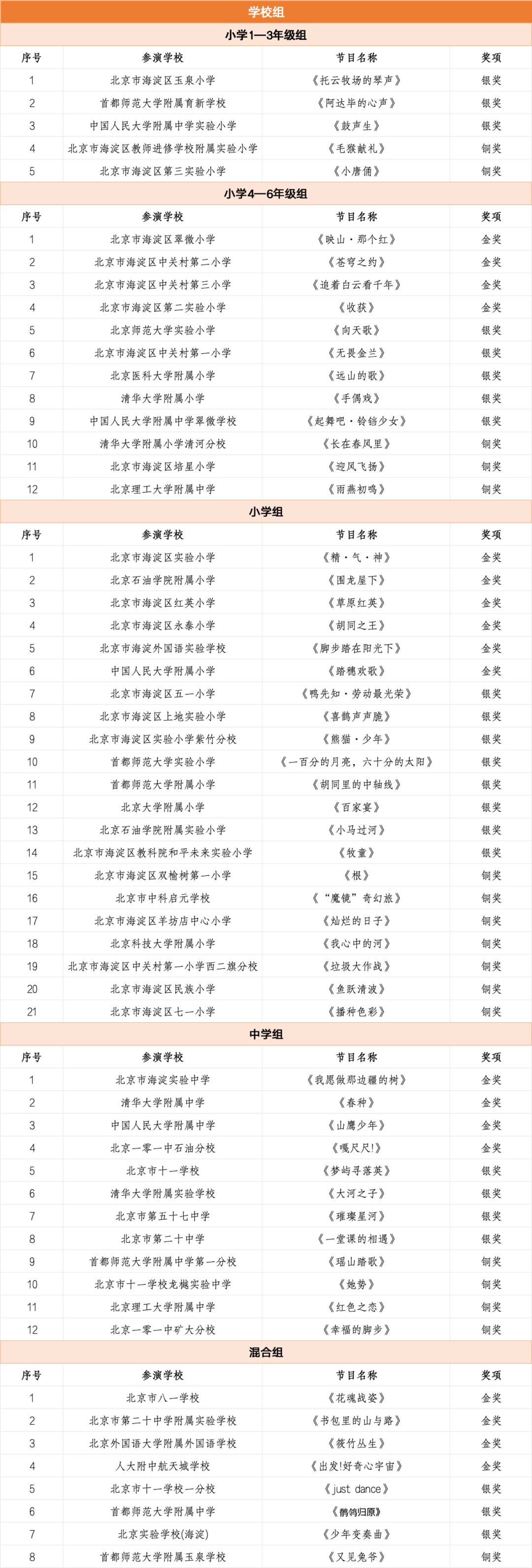 北京市第二十八届学生艺术节舞蹈展演获奖名单