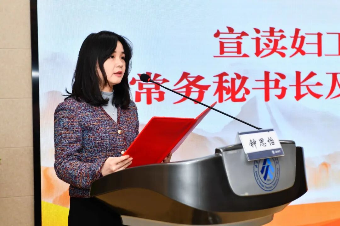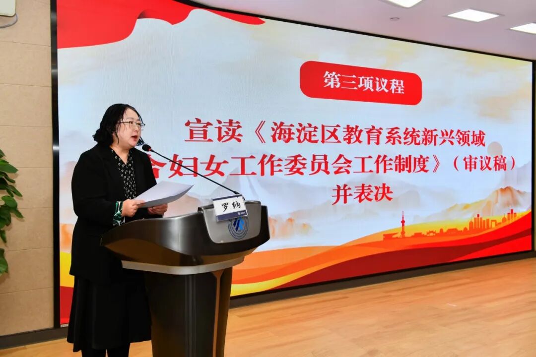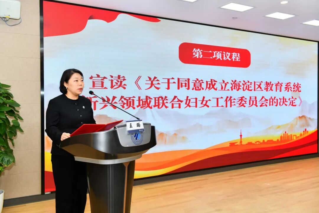 海淀区委教工委组织科科长王璐宣读《关于同意成立海淀区教育系统新兴领域联合妇女工作委员会的决定》。