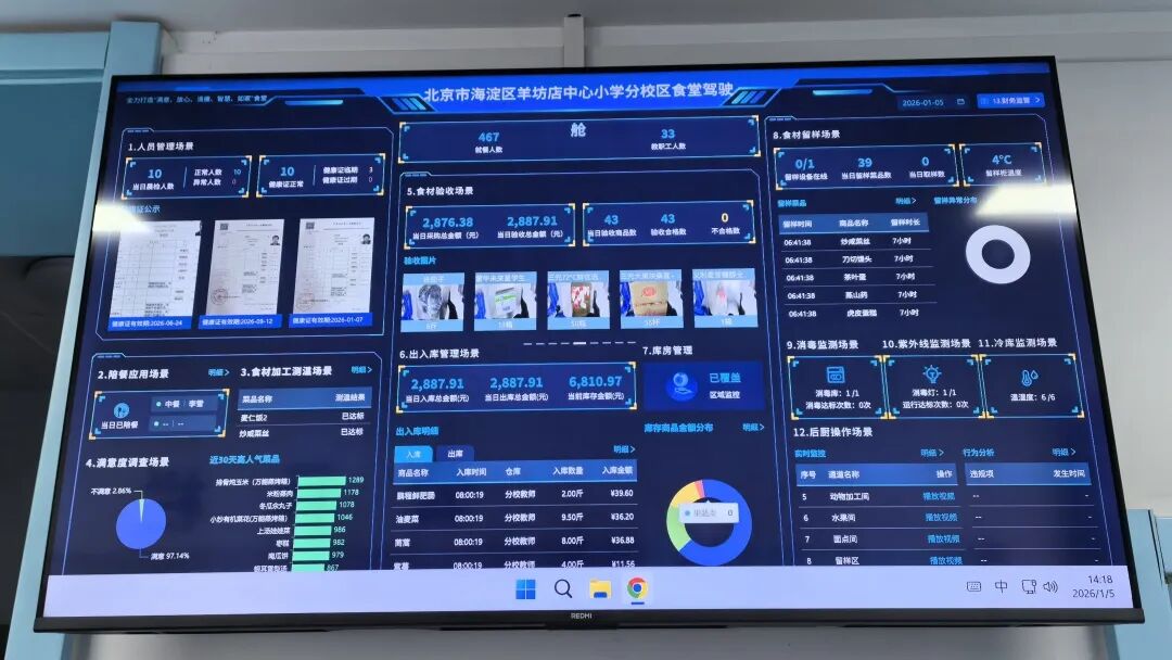 吴女士口中的“大屏”是该校食堂的“驾驶舱”,也是智慧食安系统中智慧食堂后厨管理模块的学校智能信息中控展示平台。数据显示,截至目前,海淀区199所中小学(187所区属公办中小学、12所部属及市属附中附小)和64所区属公办幼儿园食堂已完成后厨智慧管理系统的建设工作,并完成系统调试。