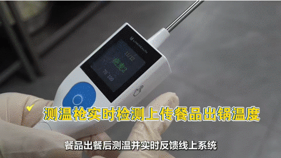 在羊坊店中心小学食堂的不少区域,都可以看到一个巴掌大小的绿色“盒子”,它们实时监测着冷库等不同位置的温度,并将数据回传至食安系统。专门负责测量菜品出餐温度的工作人员手持智能设备,选中菜品名称后用探头测量温度,测量数据便同步完成上传……
