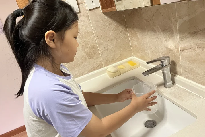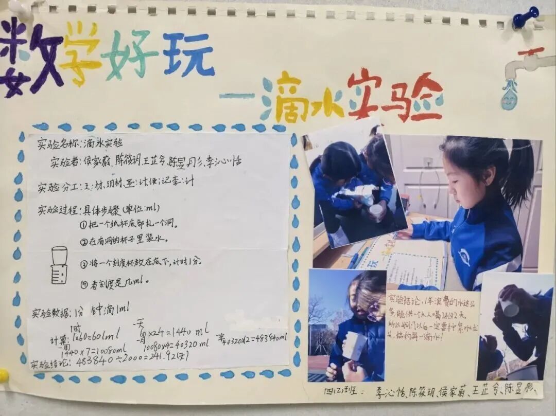 学校以四年级数学上册《滴水实验》为依托,以数学学科为引领,各学科老师团结合作、合力策划并开展了“节约水资源,从点滴做起”跨学科实践活动。同学们以小组为单位,紧扣“如何通过数学测量获得准确数据”核心,结合科学实验规范,展开激烈讨论。在数学测量逻辑的指引下,各小组明确了“固定滴水速度”等关键要求,详细撰写了实验方案,将数学“精准量化”的核心思想贯穿实验规划全程。经过反复调整与实验,同学们获取了精准的数学原始数据,并开启核心的数学推算,最终得出“一个水龙头一年可能浪费数百升水”的结论。