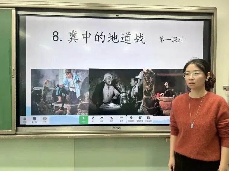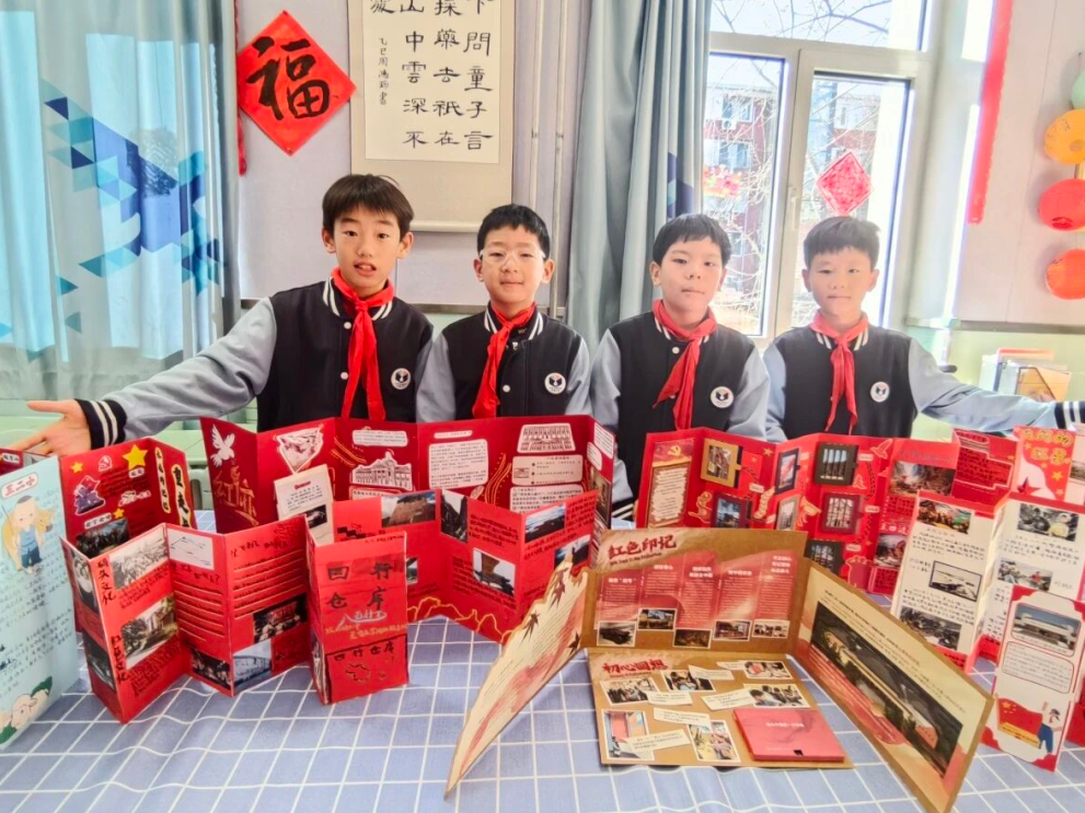 学校五年级开展了“铭记历史 爱我中华”跨学科主题学习活动。设计红色景点折页册,是本次跨学科学习的核心实践任务。为了打造一本鲜活生动的红色景点折页册,学校将语文、音乐、数学、英语、道德与法治、美术等学科有机联动,将课本知识与红色景点的历史底蕴、文化内涵深度融合,带领同学们在沉浸式体验中完成这本满载红色记忆的折页册。
