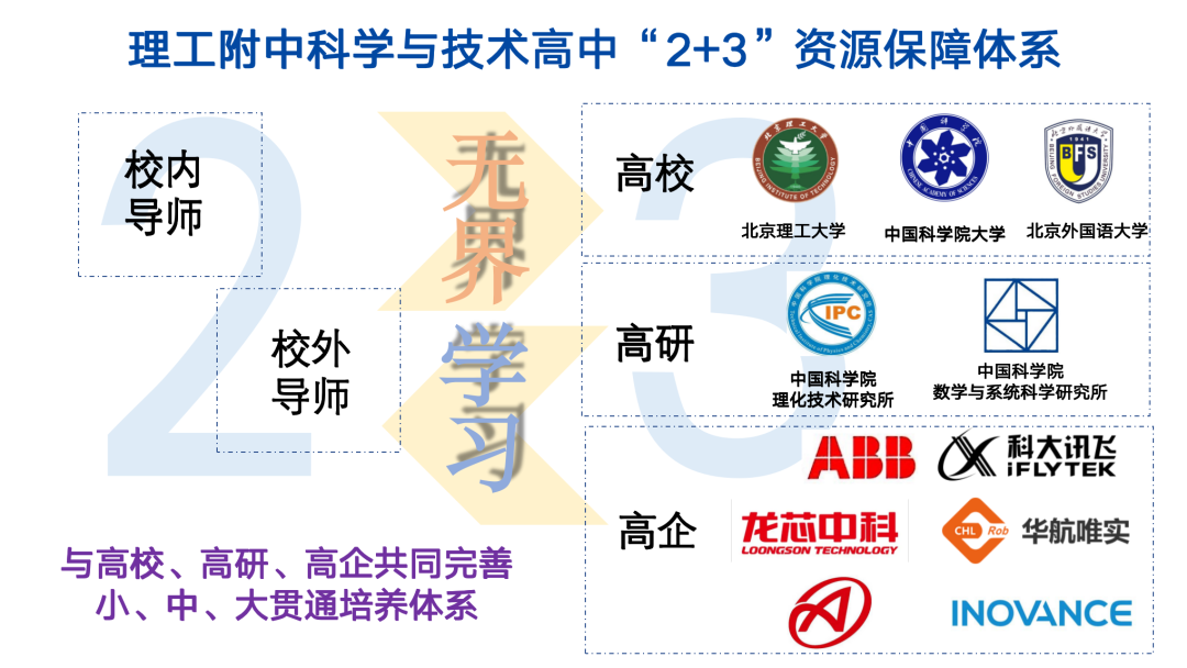 理工附中深知,科学教育的“加法”与科学工程特色建设绝不是学校单打独斗可以完成的,必须打开校门,引入“活水”。学校构建了“2+3”资源保障体系,其中“2”指校内校外双导师制,“3”指高校、高研院所、企业的三方资源。