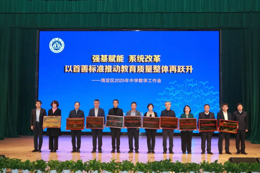 ▲ 海淀区2025年中学教学工作会上,与会领导为海淀区首批科学与技术高中颁牌