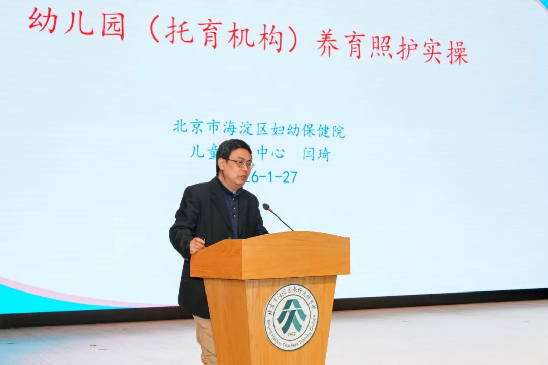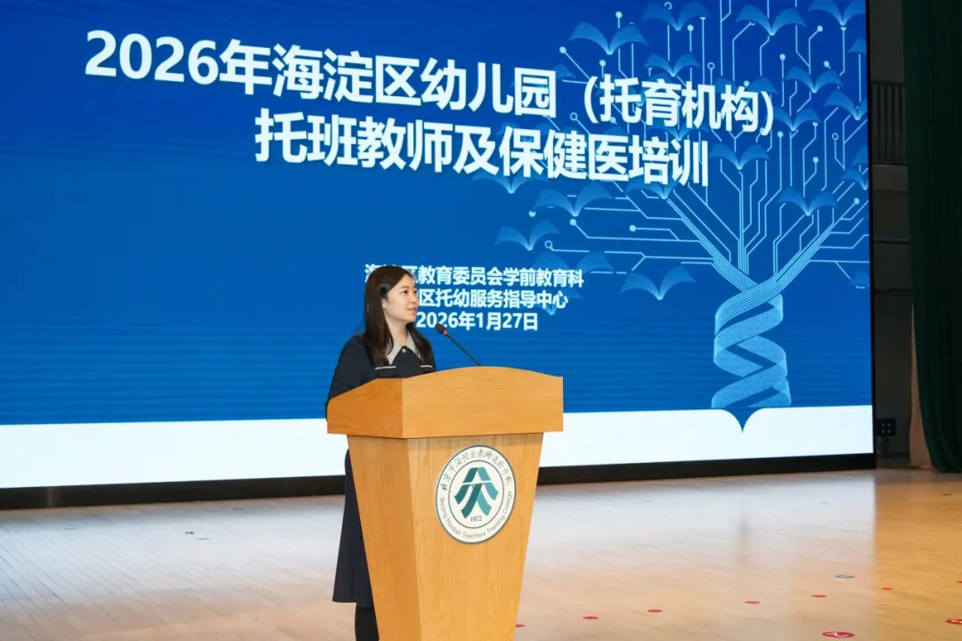 海淀区教育委员会学前教育科科长刘海英在致辞中表示,要系统推进托幼一体化服务体系建设,大力开展医育融合,加强从业人员队伍建设,助力托班教师和保健医专业成长,以教师专业性跃升带动服务质量跃升,真正实现“幼有优育”,切实减轻家庭养育负担,释放生育与发展潜能。