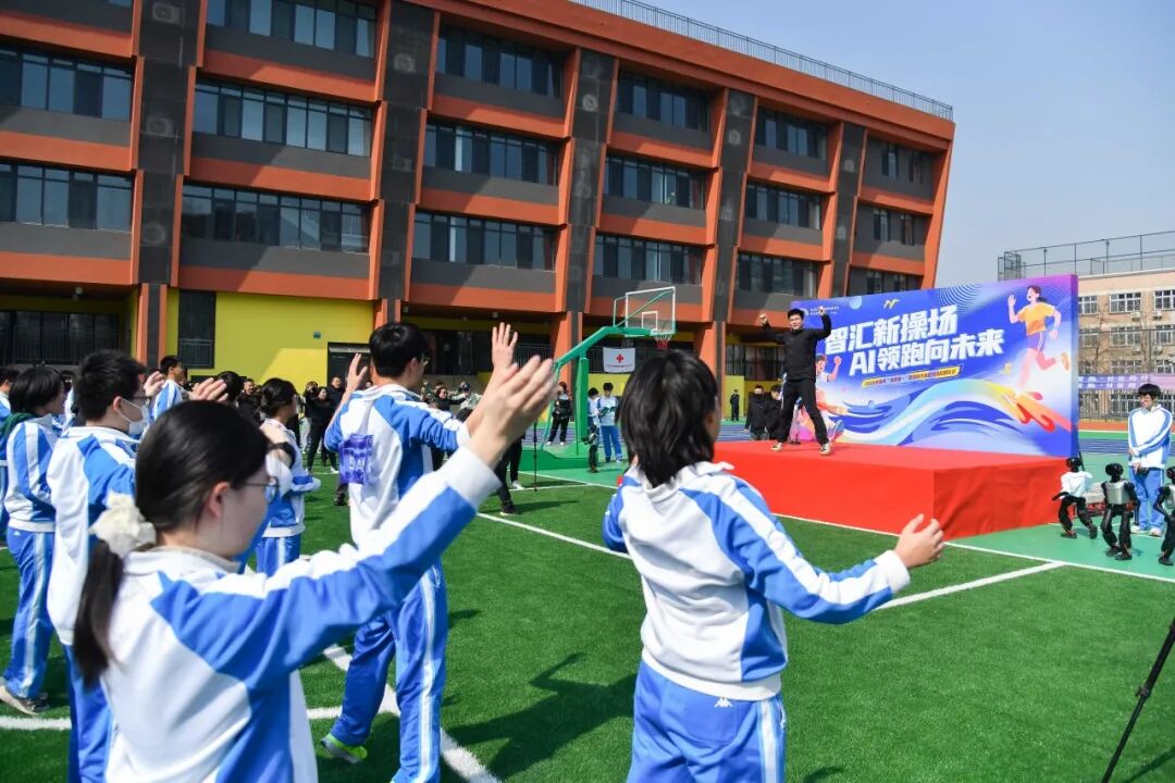 随着曾辉宣布活动开始,专业领操员与AI机器人“小跑”同台领操,带领全体师生开展活力热身。