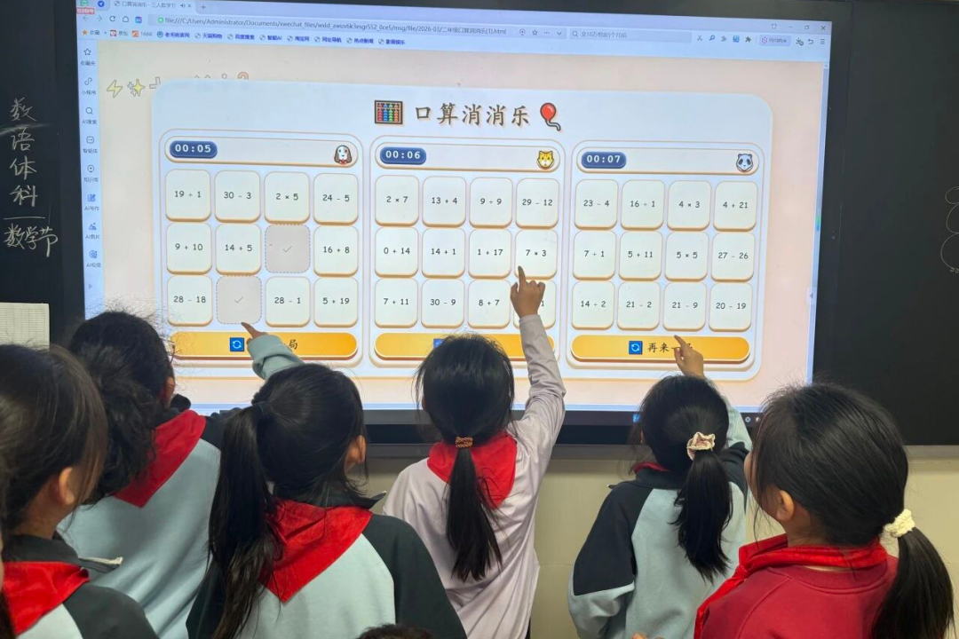 在“数感圈圈圈”“量角器炮塔”“旋转找生肖”“轴对称画板”等小游戏中,同学们手指在屏幕上轻轻一点,课堂上讲过的数学知识瞬间变成了闯关秘籍。