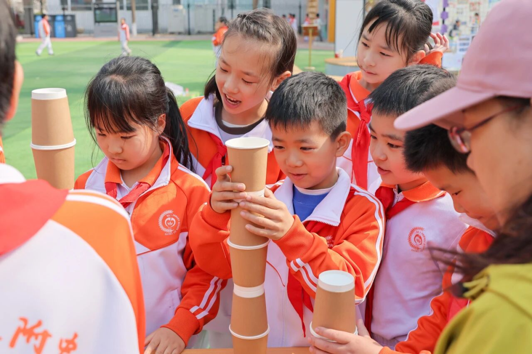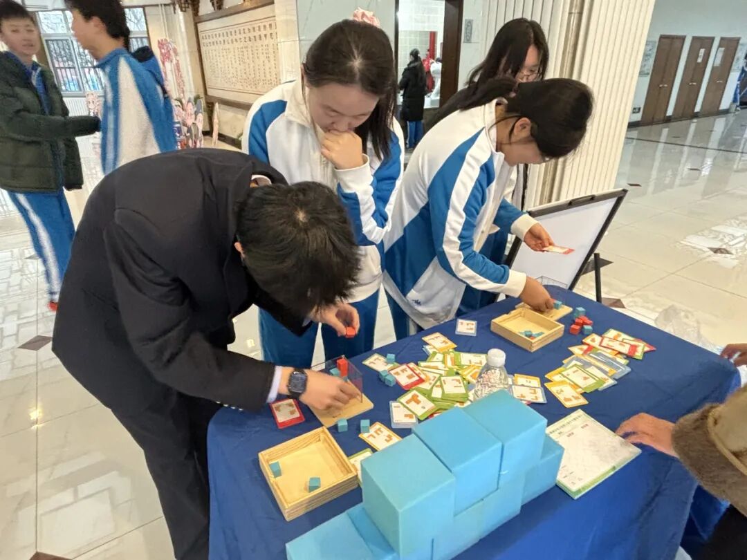 “纸杯叠高”“隐藏积木”“猫抓老鼠桌游”“轨道逻辑棋”等摊位热闹非凡。同学们凝视注目,巧动脑力,在游戏中锻炼逻辑思维。