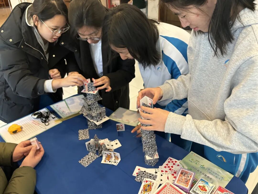 汉诺塔前,选手们的手指在圆盘间翻飞;意面大挑战与纸牌搭建体验区人数爆满;学生组织的“达芬奇密码”前,师生同台PK……数学游戏区和数学体验区变成校园里的“顶流打卡点”。