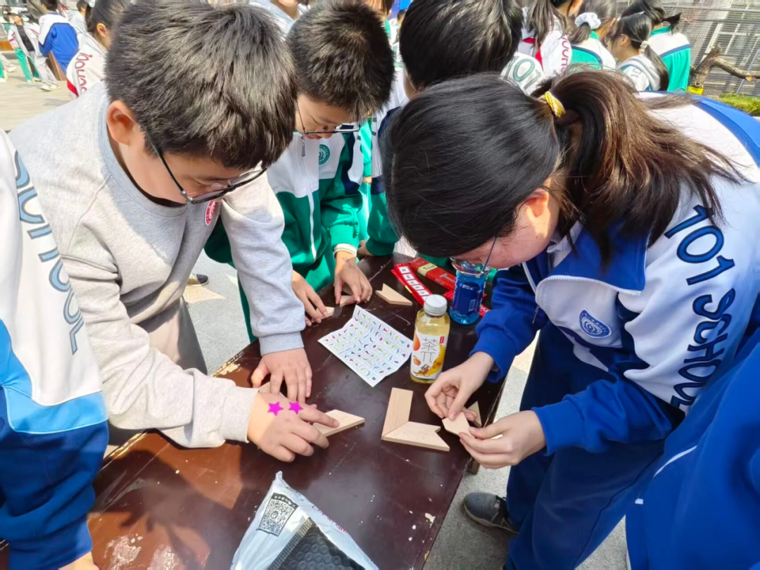 四巧板和T字之谜挑战、魔方闯关、数字推理大战、数学跳棋运算、几何棋盘、趣味24点六大闯关赛道人头攒动。同学们在游戏中锻炼了数学思维,激发了对数学的兴趣。