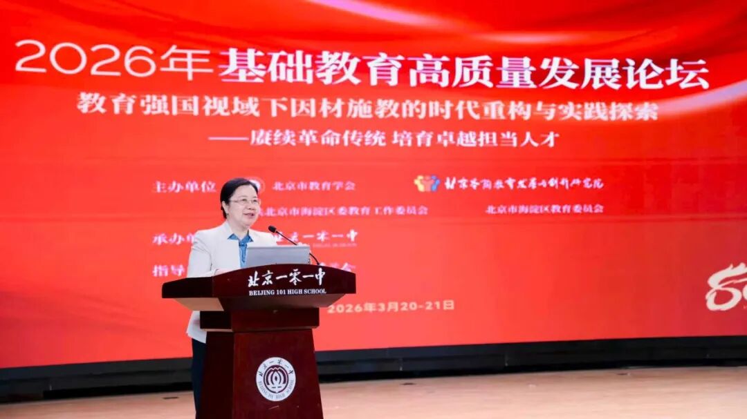 3月20日至21日,2026年基础教育高质量发展论坛在北京一零一中举行。本次论坛以教育强国视域下因材施教的时代重构与实践探索一一赓续革命传统 培育卓越担当人才为主题,各界领导、专家学者、教育同仁1000余人共探育人新路,为教育强国建设凝聚共识、汇聚力量。