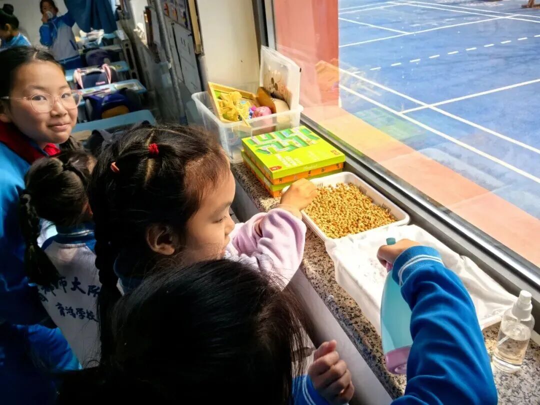 一、二年级的“小小种植家”们专注于水培芽苗菜:铺纱布、均匀撒种、定量添加营养液……每一个步骤都考验着细致与耐心;