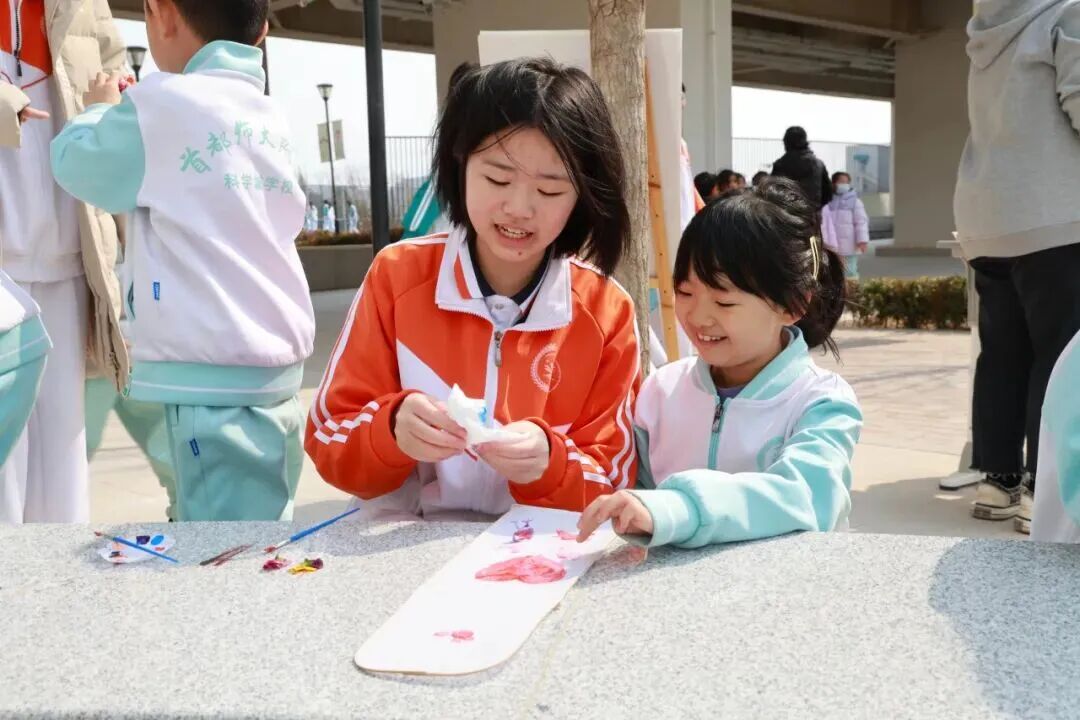 “花草风筝派对”摊位上,小学部的弟弟妹妹们蹲在草地上,为素净的风筝贴一朵小花;初中部的哥哥姐姐们用颜料挥洒创意,用落叶拼出独特的图案。
