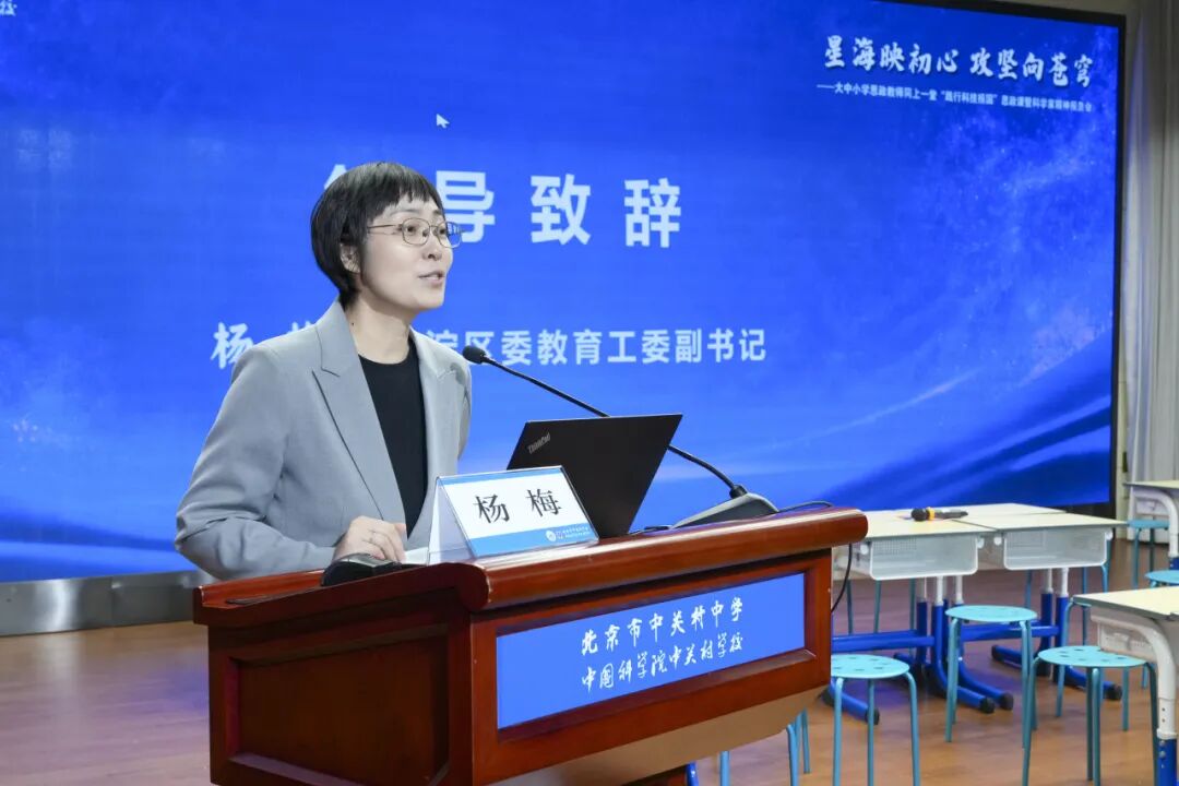 海淀区委教育工委副书记杨梅为活动致辞,她表示,思政课是落实立德树人根本任务的关键课程,是筑牢青少年信念的基础。玉泉小学、中关村中学与中国科学院大学马克思主义学院深入探索,取得了富有启发性的成果,共同构建了大中小学思政课一体化共同体,回应了习近平总书记弘扬科学家精神、建设科技强国的嘱托。