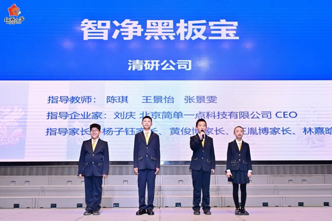 10组商业企划案,聚焦生活真实问题。有的小组着眼于教室里粉尘飞扬的真实困扰,发明了“智净黑板宝”——自动擦黑板仪;有的小组钻研传统草木染技艺,试图让古老工艺在当代找到新的表达;还有的小组运用AI技术修复老照片,把“家族记忆”做成了一个可落地的项目。在120分钟的路演与答辩中,他们呈现的不仅是一场“儿童版”的商业模仿秀,而是一个个真实、有逻辑、有数据支撑的方案展示。