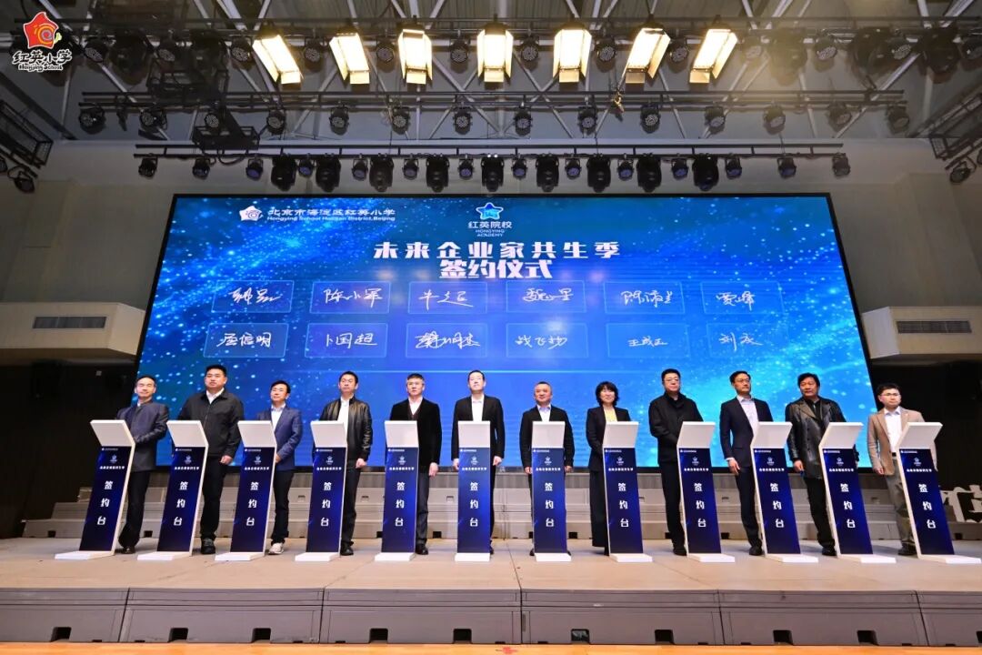 民建中央企业委副主任陈小军、北京市人工智能高级工程师张发恩、星火智缘董事长韩晟、炜衡律师事务所高级合伙人战飞扬、简单云创始人刘庆、昌久律师事务所高级合伙人屈信明、中能锐赫科技创始人韩明杰、软通动力副总裁牛超、中关村商会秘书长贾峰、海淀区乡镇企业协会原会长王成玉等首批成员签署联盟意向书,并从学校手中接过“红英少年商学院导师”聘书。
