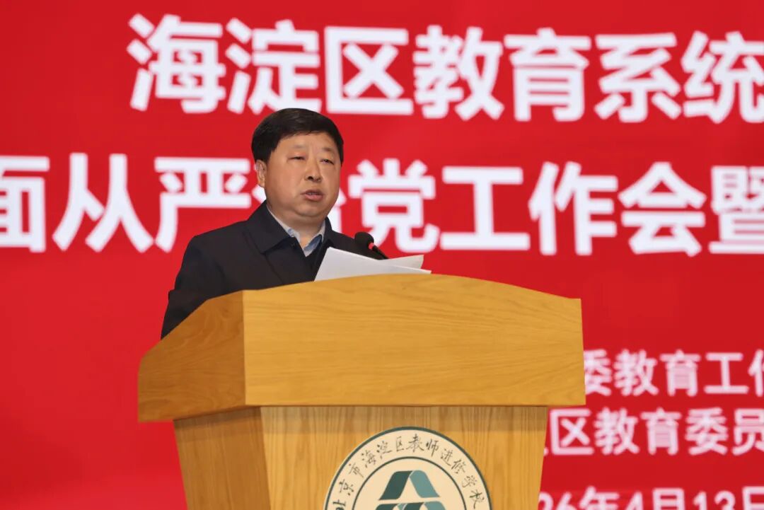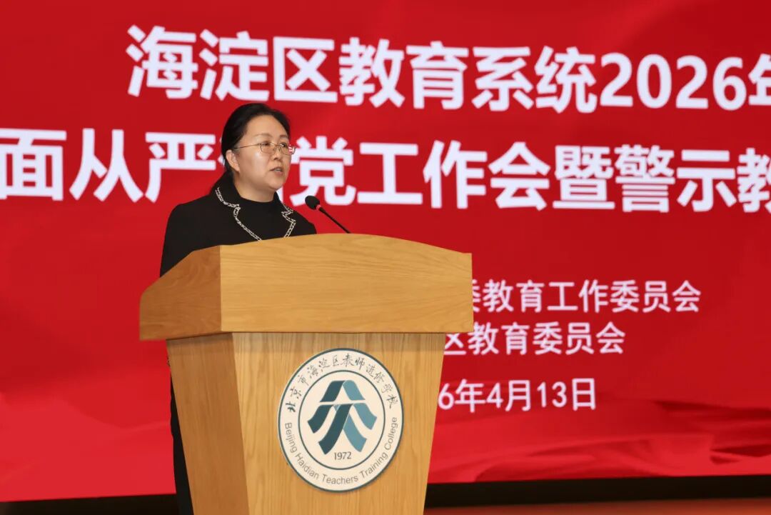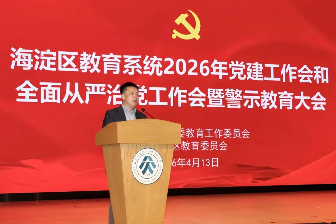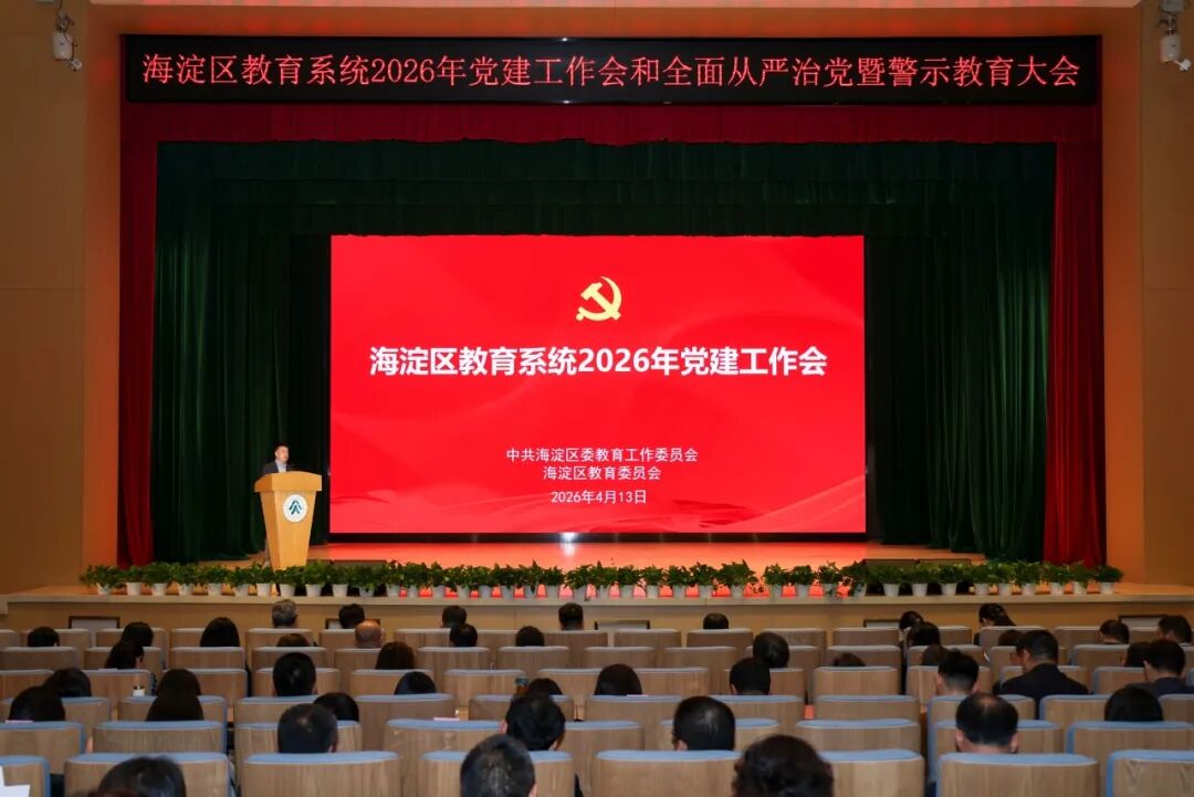 4月13日, 海淀区教育系统召开2026年党建工作会和全面从严治党工作会暨警示教育大会。海淀区委教育工委、区教委领导班子成员、驻区委教工委区教委纪检监察组、机关调研员、各科室负责人,区教育系统所属各单位党政正职、副书记、纪检委员,区教育系统党建督查组督查员,以及教科院科级以上干部、资核中心科级以上干部在主会场参会。区教委所属各单位行政副校长、后勤主任在分会场参会。会议由海淀区委教育工委副书记、区教委主任付海涛主持。